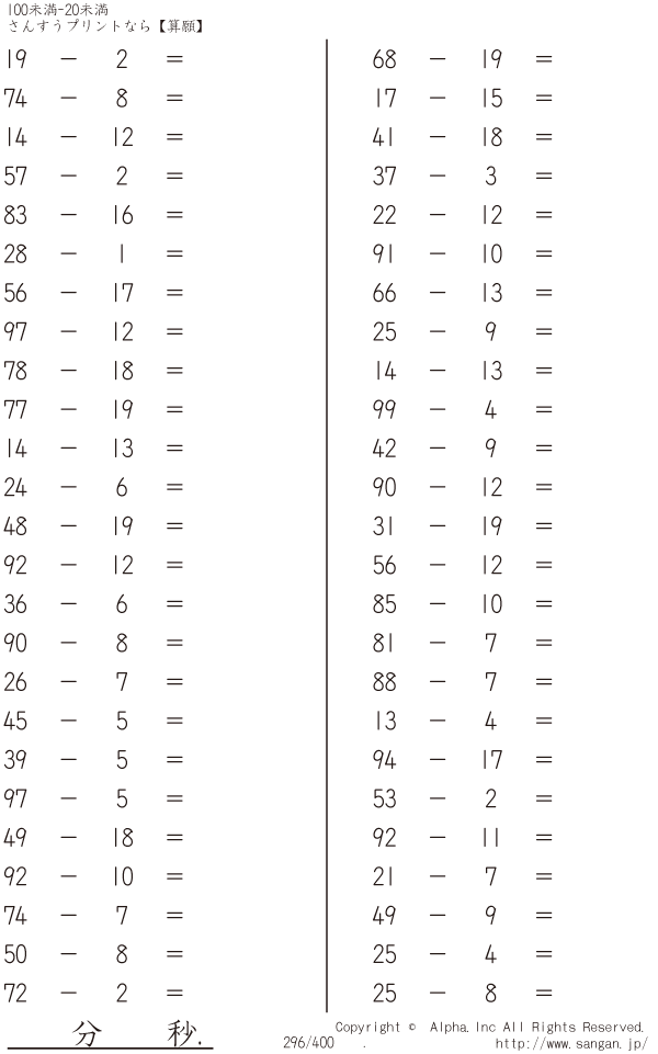 上記のボタンから「100未満-20未満」の算数数学ドリル・計算ドリル(PDFプリント)がダウンロードできます。個人利用は無料です(家庭以外での配布は有料です)。