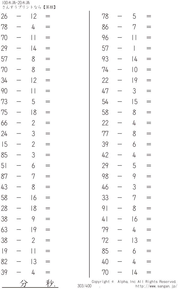 上記のボタンから「100未満-20未満」の算数数学ドリル・計算ドリル(PDFプリント)がダウンロードできます。個人利用は無料です(家庭以外での配布は有料です)。