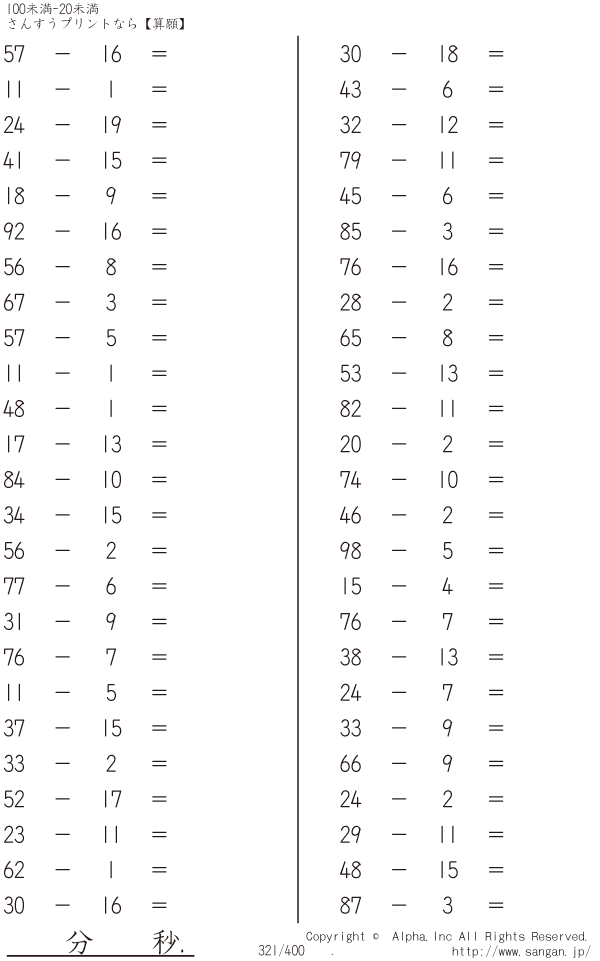上記のボタンから「100未満-20未満」の算数数学ドリル・計算ドリル(PDFプリント)がダウンロードできます。個人利用は無料です(家庭以外での配布は有料です)。