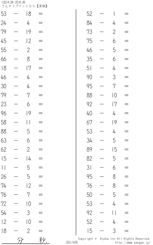 上記のボタンから「100未満-20未満」の算数数学ドリル・計算ドリル(PDFプリント)がダウンロードできます。個人利用は無料です(家庭以外での配布は有料です)。