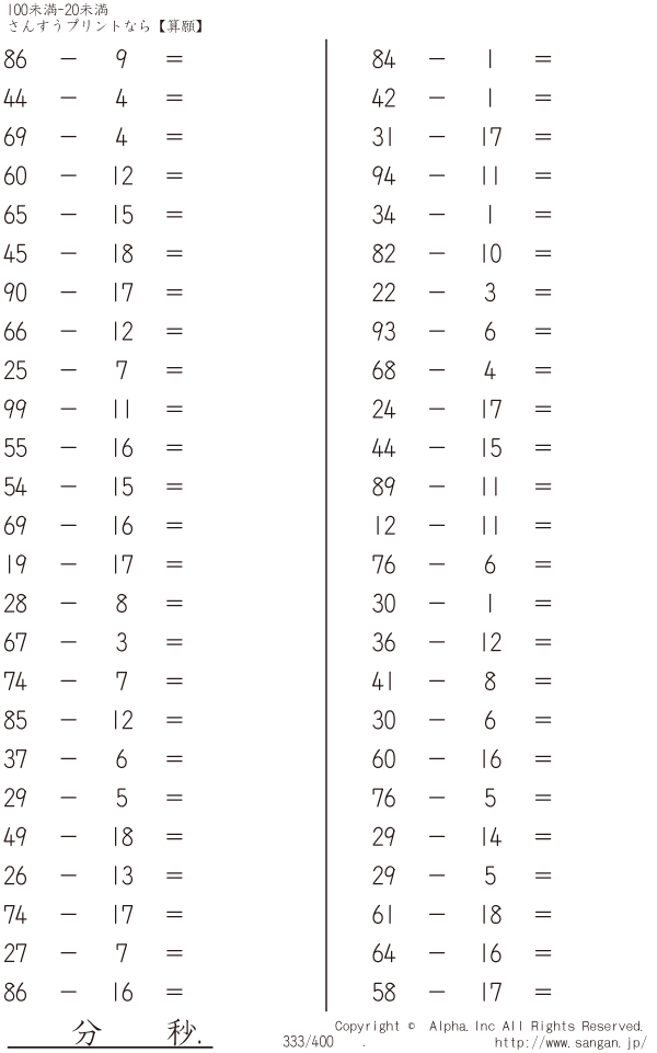 上記のボタンから「100未満-20未満」の算数数学ドリル・計算ドリル(PDFプリント)がダウンロードできます。個人利用は無料です(家庭以外での配布は有料です)。