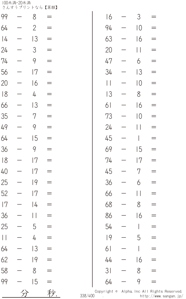 上記のボタンから「100未満-20未満」の算数数学ドリル・計算ドリル(PDFプリント)がダウンロードできます。個人利用は無料です(家庭以外での配布は有料です)。