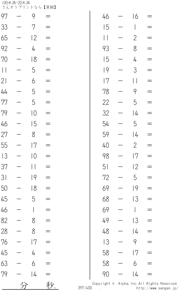上記のボタンから「100未満-20未満」の算数数学ドリル・計算ドリル(PDFプリント)がダウンロードできます。個人利用は無料です(家庭以外での配布は有料です)。