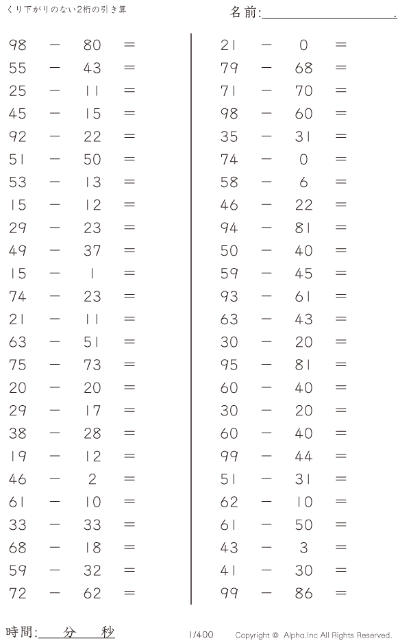 上記のボタンから「くり下がりのない2桁の引き算」の算数数学ドリル・計算ドリル(PDFプリント)がダウンロードできます。個人利用は無料です(家庭以外での配布は有料です)。