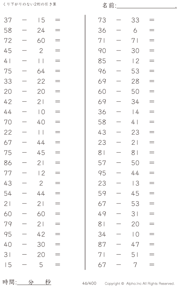 上記のボタンから「くり下がりのない2桁の引き算」の算数数学ドリル・計算ドリル(PDFプリント)がダウンロードできます。個人利用は無料です(家庭以外での配布は有料です)。