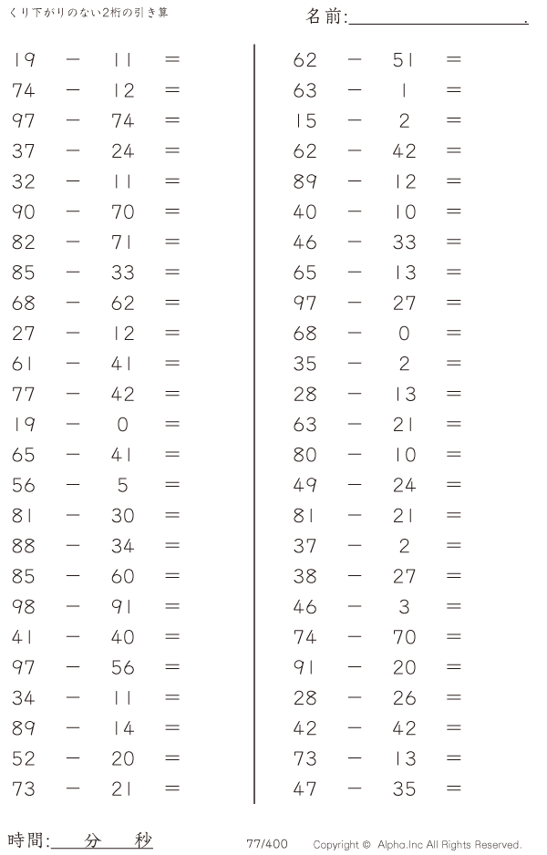 上記のボタンから「くり下がりのない2桁の引き算」の算数数学ドリル・計算ドリル(PDFプリント)がダウンロードできます。個人利用は無料です(家庭以外での配布は有料です)。