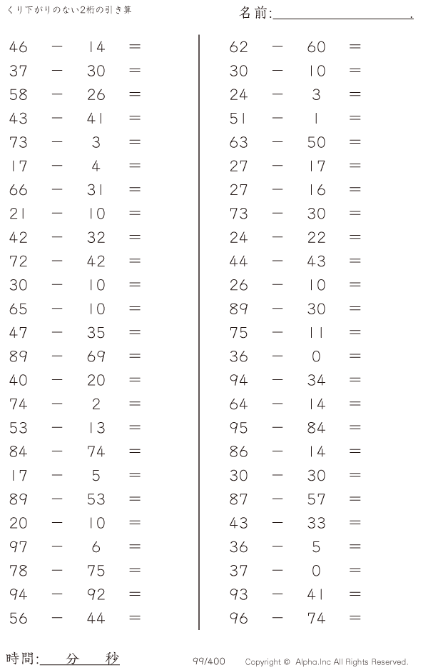上記のボタンから「くり下がりのない2桁の引き算」の算数数学ドリル・計算ドリル(PDFプリント)がダウンロードできます。個人利用は無料です(家庭以外での配布は有料です)。