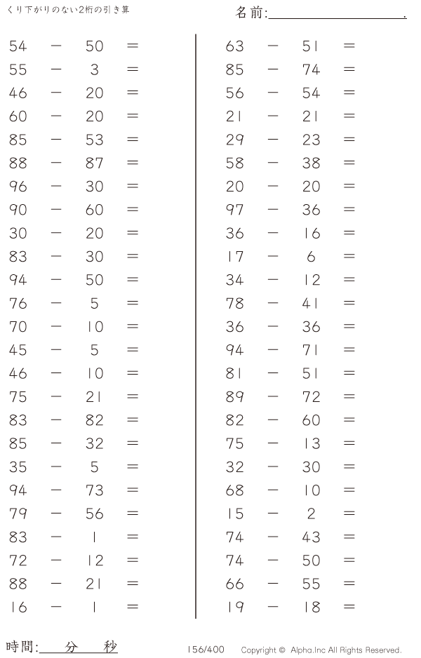 上記のボタンから「くり下がりのない2桁の引き算」の算数数学ドリル・計算ドリル(PDFプリント)がダウンロードできます。個人利用は無料です(家庭以外での配布は有料です)。