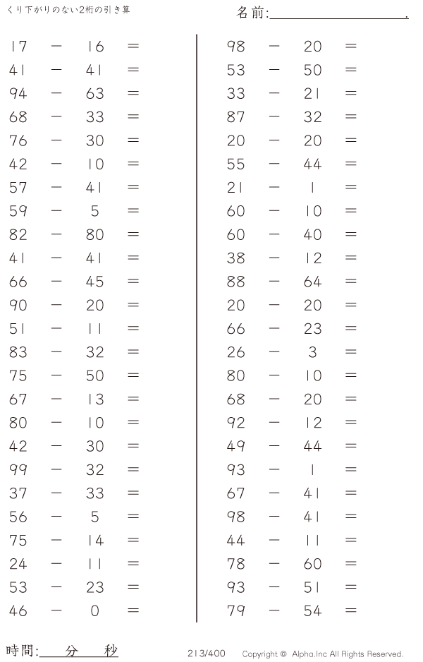 上記のボタンから「くり下がりのない2桁の引き算」の算数数学ドリル・計算ドリル(PDFプリント)がダウンロードできます。個人利用は無料です(家庭以外での配布は有料です)。