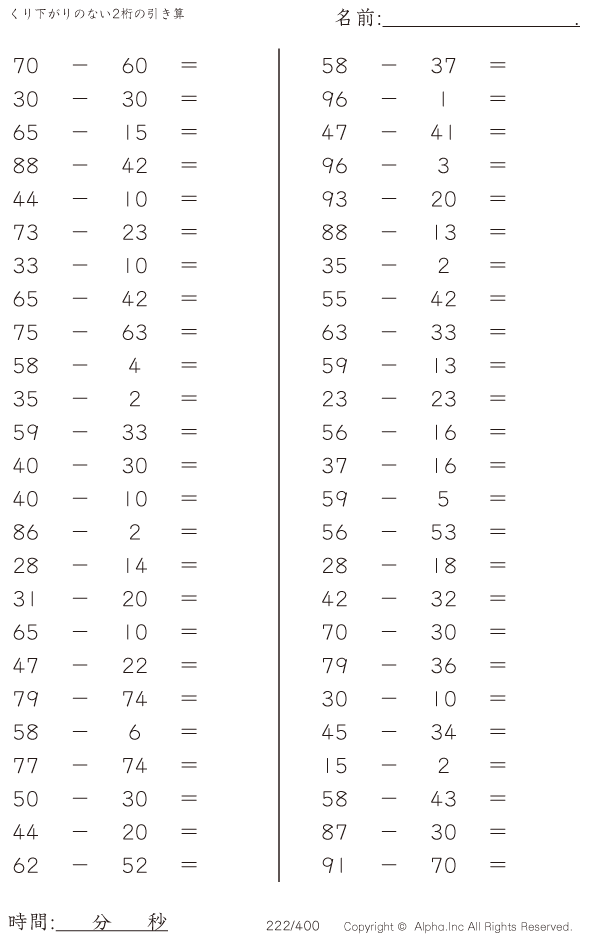上記のボタンから「くり下がりのない2桁の引き算」の算数数学ドリル・計算ドリル(PDFプリント)がダウンロードできます。個人利用は無料です(家庭以外での配布は有料です)。