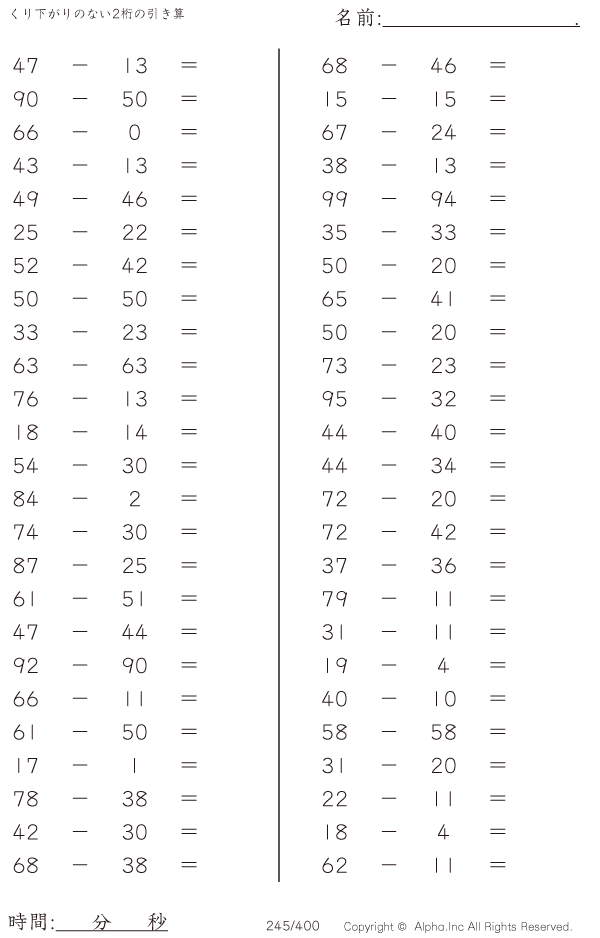 上記のボタンから「くり下がりのない2桁の引き算」の算数数学ドリル・計算ドリル(PDFプリント)がダウンロードできます。個人利用は無料です(家庭以外での配布は有料です)。