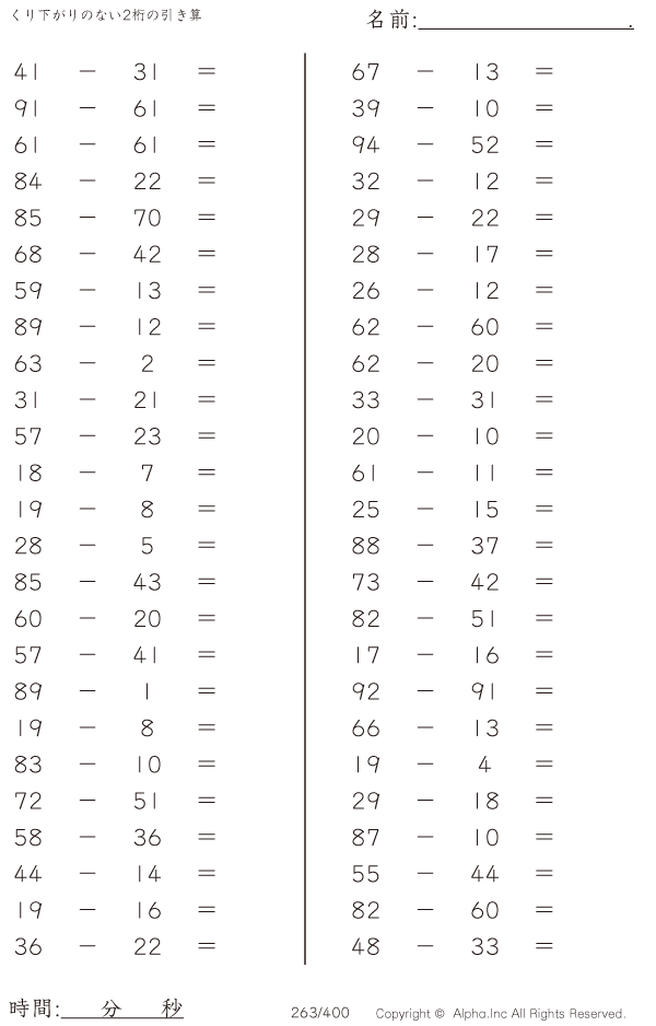 上記のボタンから「くり下がりのない2桁の引き算」の算数数学ドリル・計算ドリル(PDFプリント)がダウンロードできます。個人利用は無料です(家庭以外での配布は有料です)。