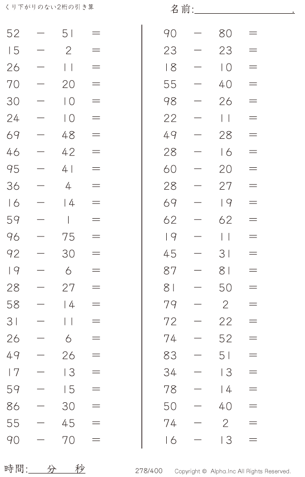 上記のボタンから「くり下がりのない2桁の引き算」の算数数学ドリル・計算ドリル(PDFプリント)がダウンロードできます。個人利用は無料です(家庭以外での配布は有料です)。