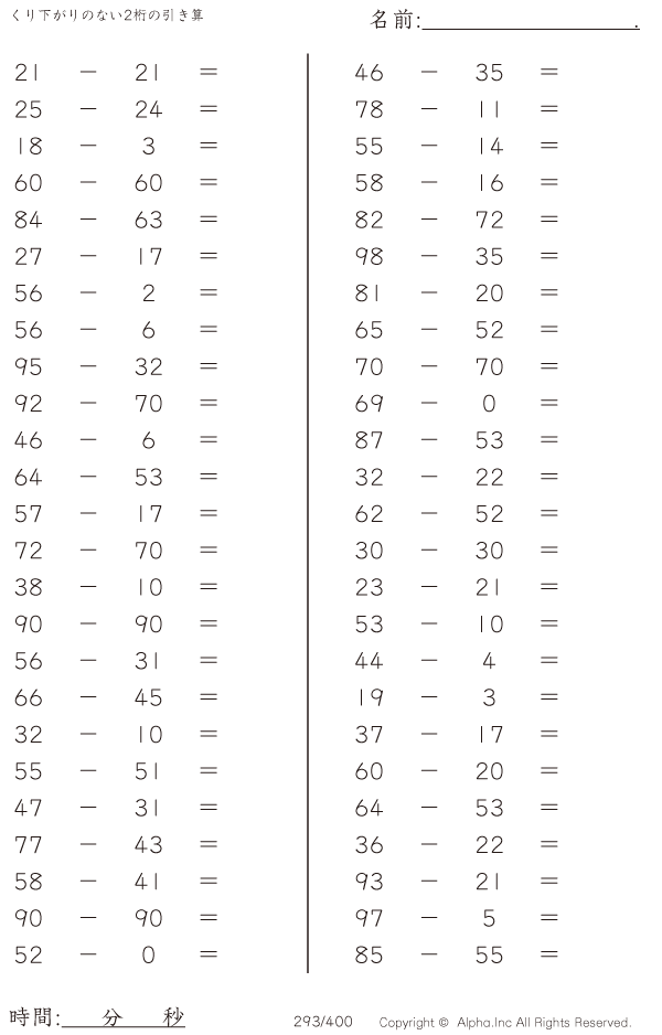上記のボタンから「くり下がりのない2桁の引き算」の算数数学ドリル・計算ドリル(PDFプリント)がダウンロードできます。個人利用は無料です(家庭以外での配布は有料です)。