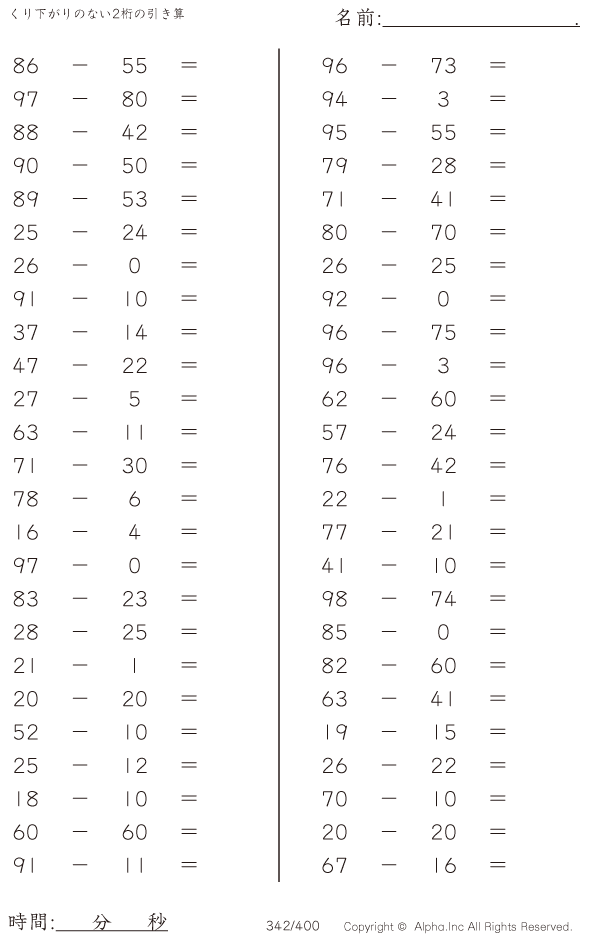 上記のボタンから「くり下がりのない2桁の引き算」の算数数学ドリル・計算ドリル(PDFプリント)がダウンロードできます。個人利用は無料です(家庭以外での配布は有料です)。