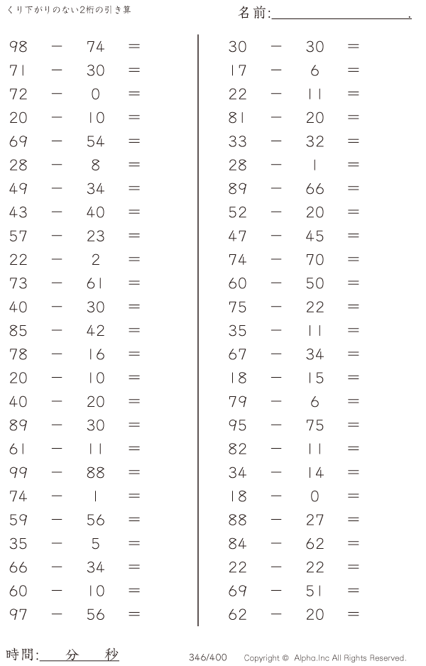上記のボタンから「くり下がりのない2桁の引き算」の算数数学ドリル・計算ドリル(PDFプリント)がダウンロードできます。個人利用は無料です(家庭以外での配布は有料です)。