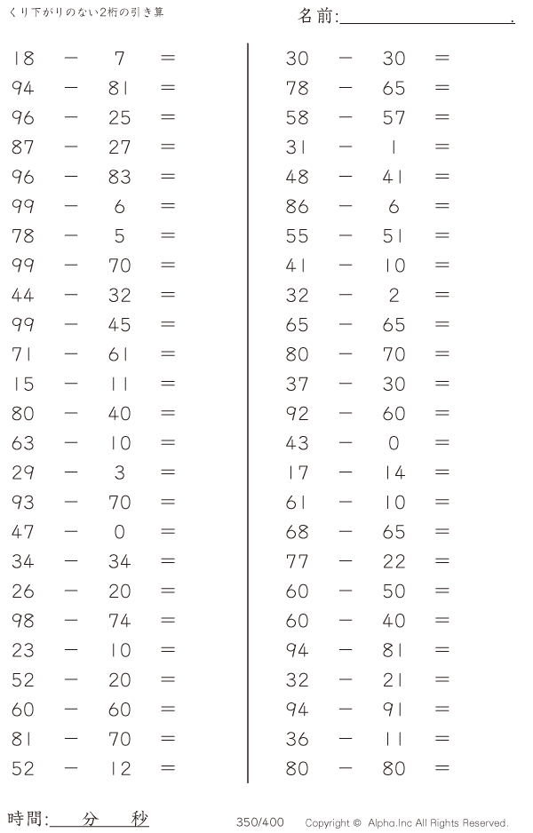 上記のボタンから「くり下がりのない2桁の引き算」の算数数学ドリル・計算ドリル(PDFプリント)がダウンロードできます。個人利用は無料です(家庭以外での配布は有料です)。