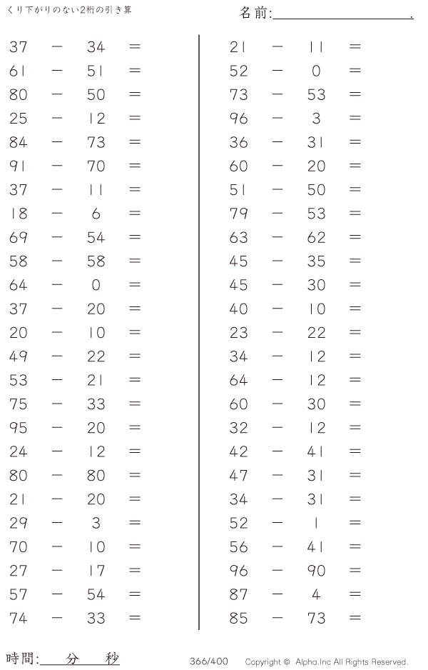 上記のボタンから「くり下がりのない2桁の引き算」の算数数学ドリル・計算ドリル(PDFプリント)がダウンロードできます。個人利用は無料です(家庭以外での配布は有料です)。