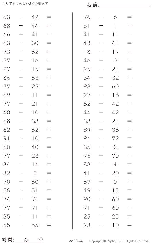 上記のボタンから「くり下がりのない2桁の引き算」の算数数学ドリル・計算ドリル(PDFプリント)がダウンロードできます。個人利用は無料です(家庭以外での配布は有料です)。