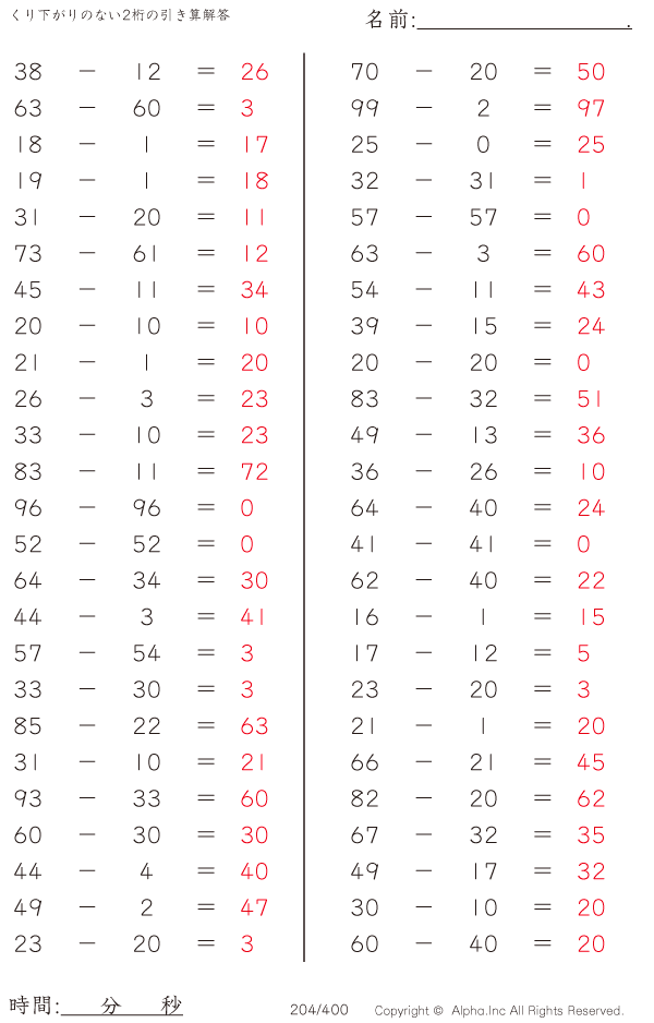 上記のボタンから「くり下がりのない2桁の引き算」の算数数学ドリル・計算ドリル(PDFプリント)がダウンロードできます。個人利用は無料です(家庭以外での配布は有料です)。