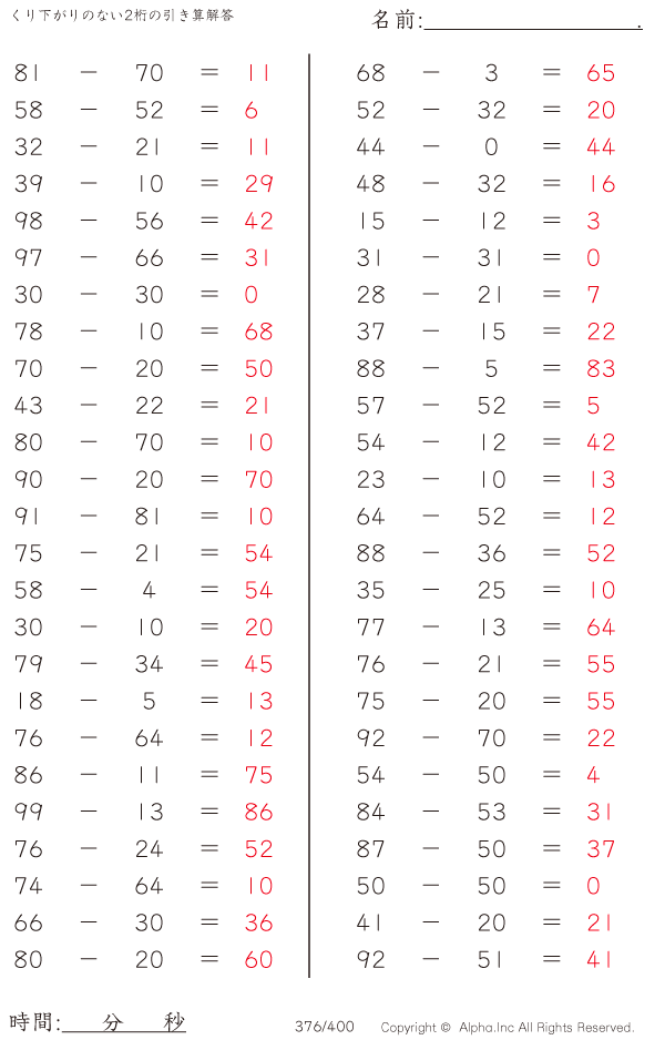 上記のボタンから「くり下がりのない2桁の引き算」の算数数学ドリル・計算ドリル(PDFプリント)がダウンロードできます。個人利用は無料です(家庭以外での配布は有料です)。