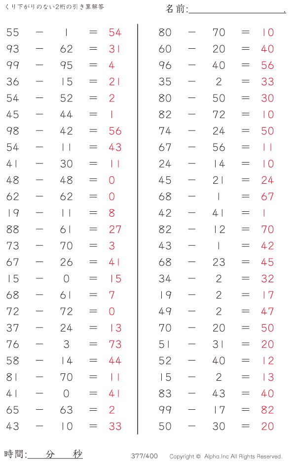 上記のボタンから「くり下がりのない2桁の引き算」の算数数学ドリル・計算ドリル(PDFプリント)がダウンロードできます。個人利用は無料です(家庭以外での配布は有料です)。