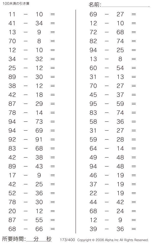 100未満の引き算 [問題]173/400