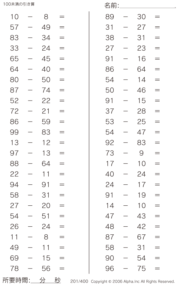 上記のボタンから「100未満の引き算」の算数数学ドリル・計算ドリル(PDFプリント)がダウンロードできます。個人利用は無料です(家庭以外での配布は有料です)。