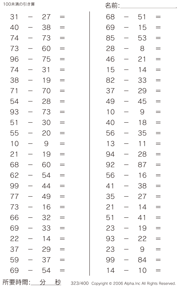 上記のボタンから「100未満の引き算」の算数数学ドリル・計算ドリル(PDFプリント)がダウンロードできます。個人利用は無料です(家庭以外での配布は有料です)。