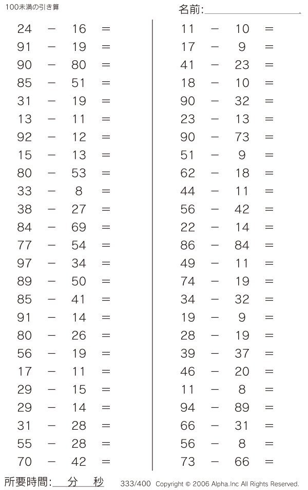 上記のボタンから「100未満の引き算」の算数数学ドリル・計算ドリル(PDFプリント)がダウンロードできます。個人利用は無料です(家庭以外での配布は有料です)。