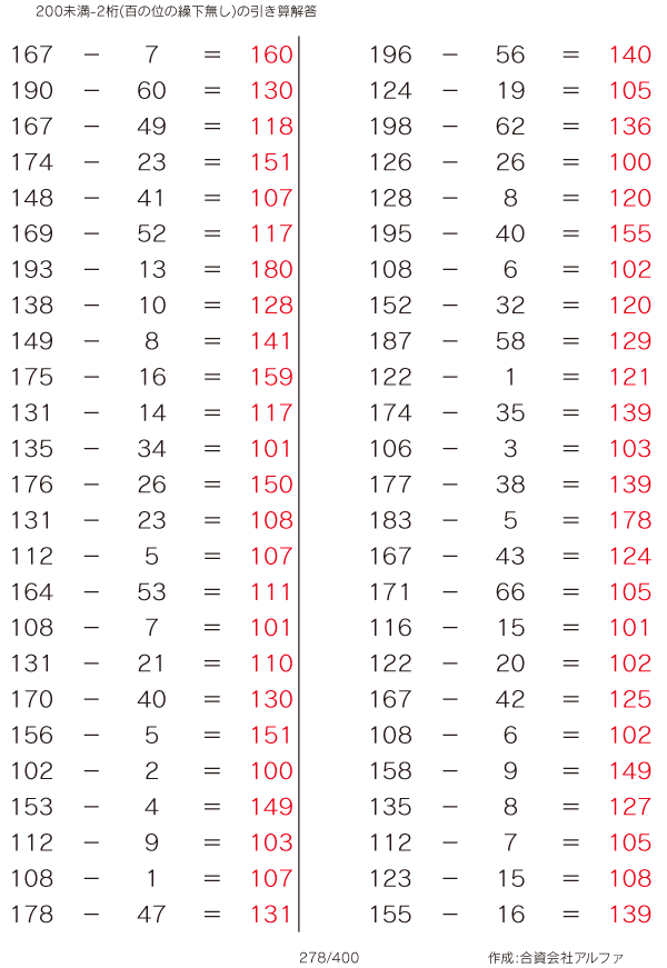200未満-2桁(100の位の繰下無し)の引き算 [解答]278/400