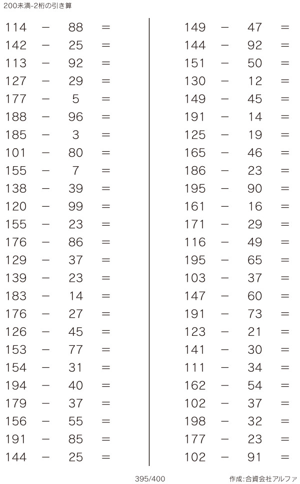 上記のボタンから「200未満-2桁の引き算」の算数数学ドリル・計算ドリル(PDFプリント)がダウンロードできます。個人利用は無料です(家庭以外での配布は有料です)。
