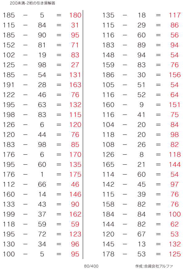 200未満-2桁の引き算 [解答]080/400