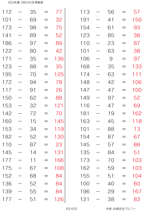 上記のボタンから「200未満-2桁の引き算」の算数数学ドリル・計算ドリル(PDFプリント)がダウンロードできます。個人利用は無料です(家庭以外での配布は有料です)。