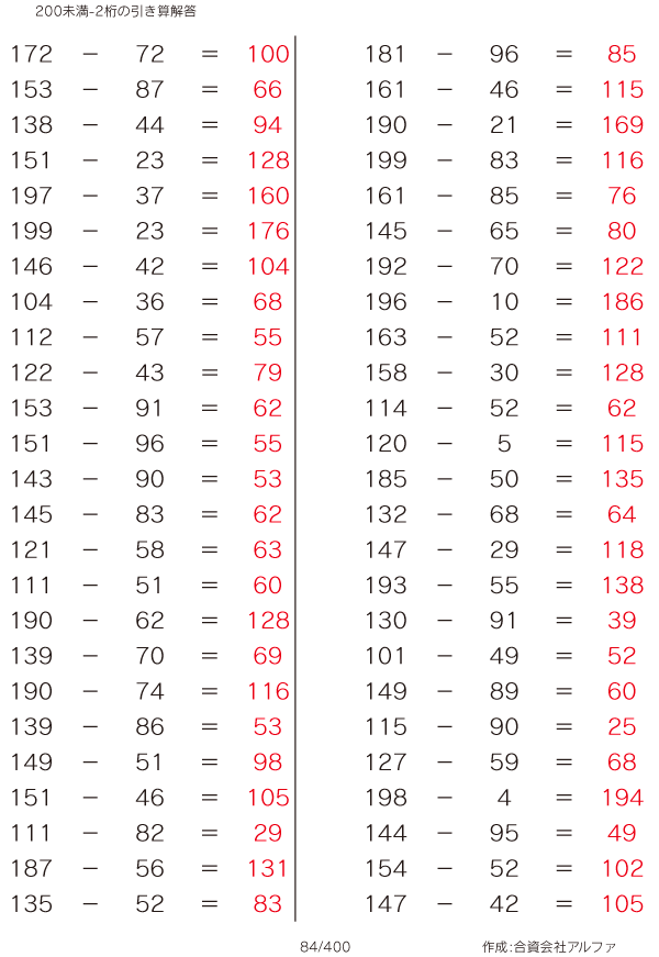 上記のボタンから「200未満-2桁の引き算」の算数数学ドリル・計算ドリル(PDFプリント)がダウンロードできます。個人利用は無料です(家庭以外での配布は有料です)。
