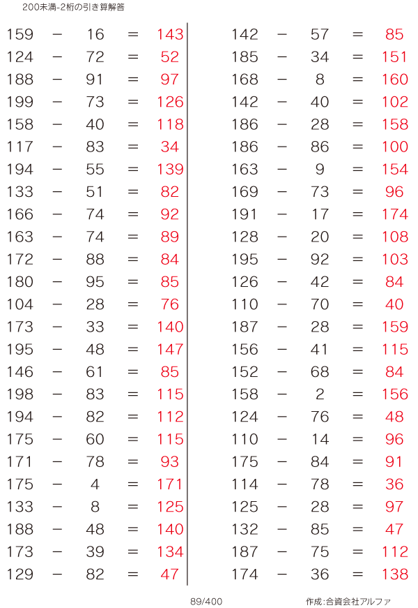 上記のボタンから「200未満-2桁の引き算」の算数数学ドリル・計算ドリル(PDFプリント)がダウンロードできます。個人利用は無料です(家庭以外での配布は有料です)。