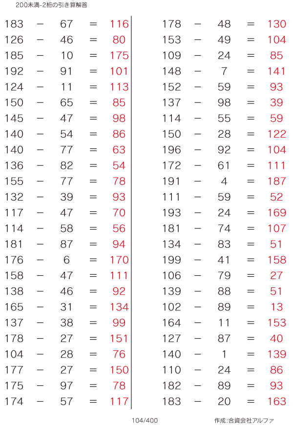 上記のボタンから「200未満-2桁の引き算」の算数数学ドリル・計算ドリル(PDFプリント)がダウンロードできます。個人利用は無料です(家庭以外での配布は有料です)。