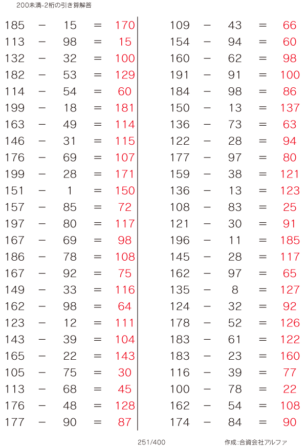 上記のボタンから「200未満-2桁の引き算」の算数数学ドリル・計算ドリル(PDFプリント)がダウンロードできます。個人利用は無料です(家庭以外での配布は有料です)。