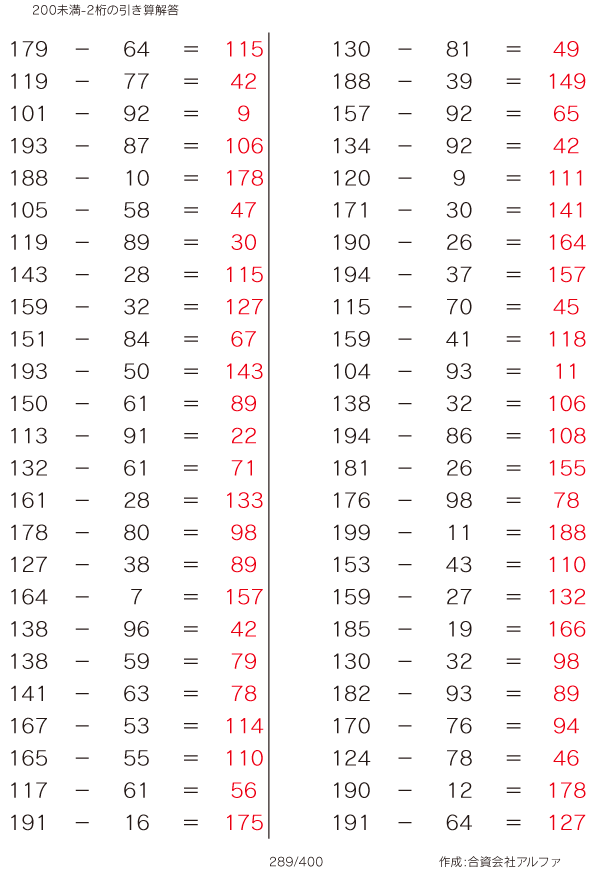 200未満-2桁の引き算 [解答]289/400