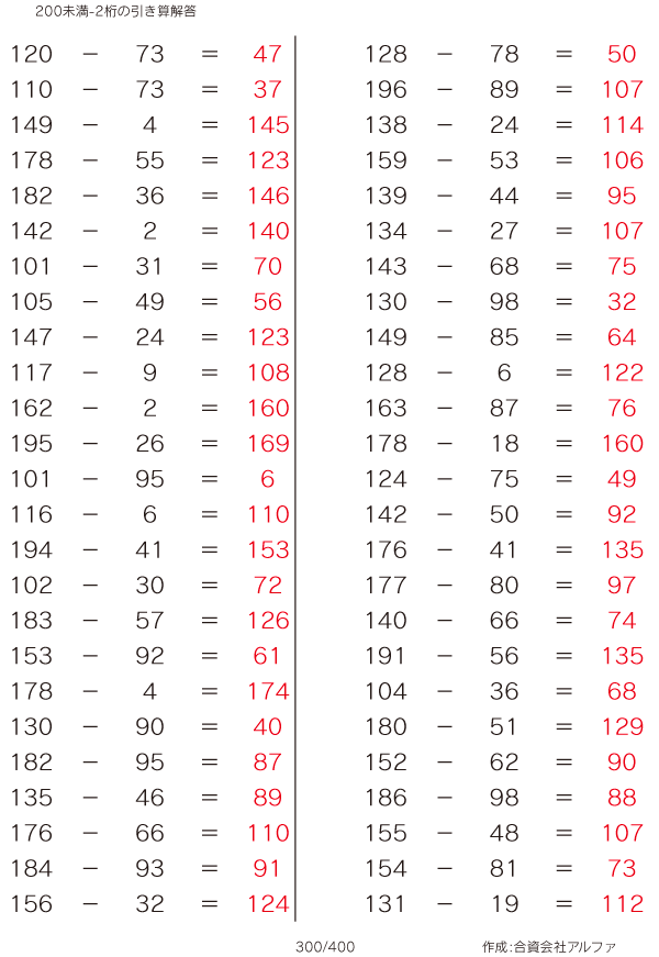 上記のボタンから「200未満-2桁の引き算」の算数数学ドリル・計算ドリル(PDFプリント)がダウンロードできます。個人利用は無料です(家庭以外での配布は有料です)。