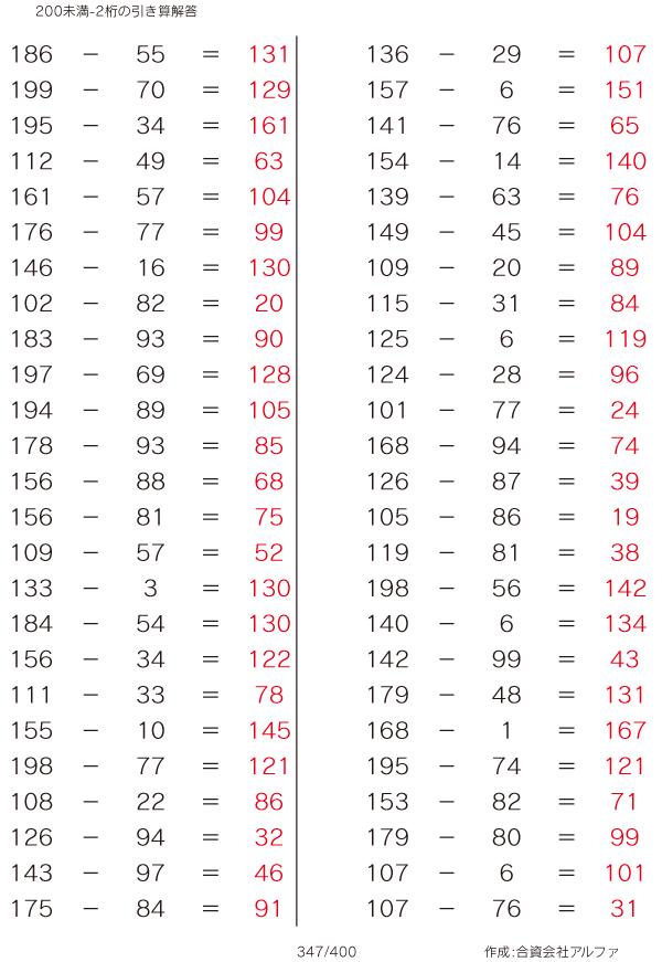 上記のボタンから「200未満-2桁の引き算」の算数数学ドリル・計算ドリル(PDFプリント)がダウンロードできます。個人利用は無料です(家庭以外での配布は有料です)。