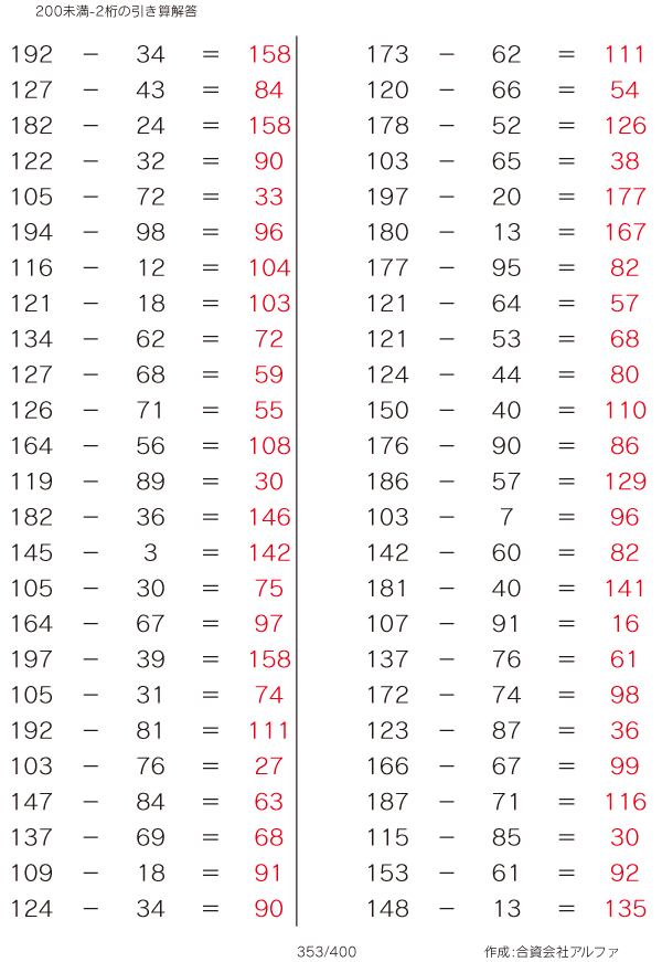 上記のボタンから「200未満-2桁の引き算」の算数数学ドリル・計算ドリル(PDFプリント)がダウンロードできます。個人利用は無料です(家庭以外での配布は有料です)。