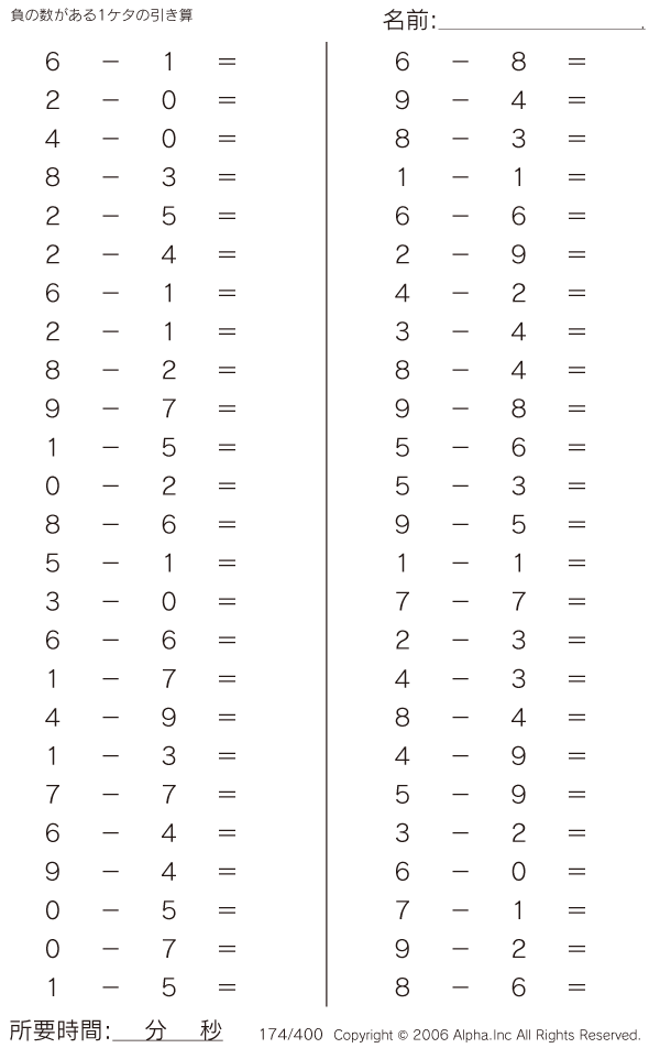 負の数がある1ケタの引き算 [問題]174/400