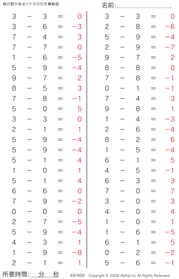 上記のボタンから「負の数がある1ケタの引き算」の算数数学ドリル・計算ドリル(PDFプリント)がダウンロードできます。個人利用は無料です(家庭以外での配布は有料です)。