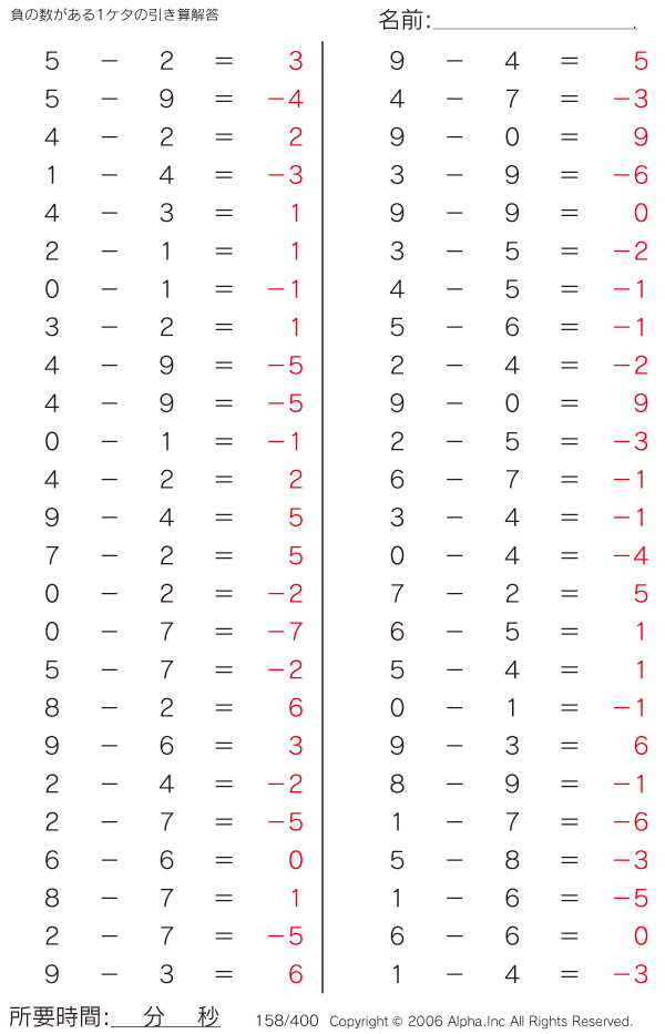 上記のボタンから「負の数がある1ケタの引き算」の算数数学ドリル・計算ドリル(PDFプリント)がダウンロードできます。個人利用は無料です(家庭以外での配布は有料です)。