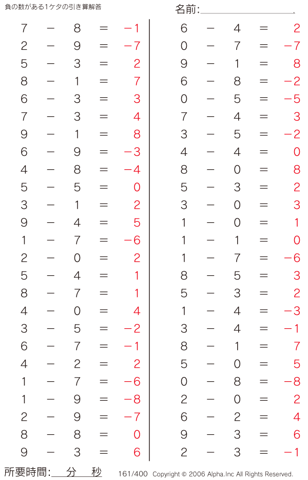 上記のボタンから「負の数がある1ケタの引き算」の算数数学ドリル・計算ドリル(PDFプリント)がダウンロードできます。個人利用は無料です(家庭以外での配布は有料です)。