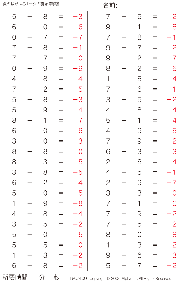 上記のボタンから「負の数がある1ケタの引き算」の算数数学ドリル・計算ドリル(PDFプリント)がダウンロードできます。個人利用は無料です(家庭以外での配布は有料です)。