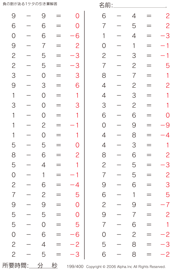 上記のボタンから「負の数がある1ケタの引き算」の算数数学ドリル・計算ドリル(PDFプリント)がダウンロードできます。個人利用は無料です(家庭以外での配布は有料です)。