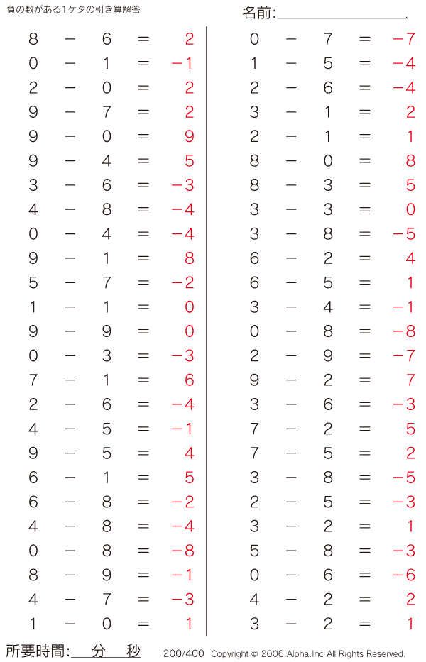 上記のボタンから「負の数がある1ケタの引き算」の算数数学ドリル・計算ドリル(PDFプリント)がダウンロードできます。個人利用は無料です(家庭以外での配布は有料です)。