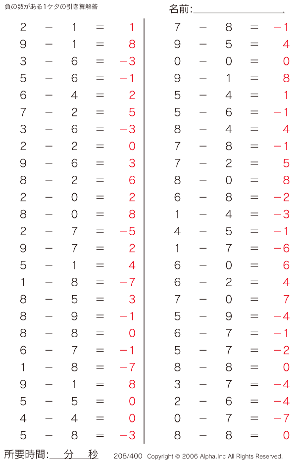 上記のボタンから「負の数がある1ケタの引き算」の算数数学ドリル・計算ドリル(PDFプリント)がダウンロードできます。個人利用は無料です(家庭以外での配布は有料です)。